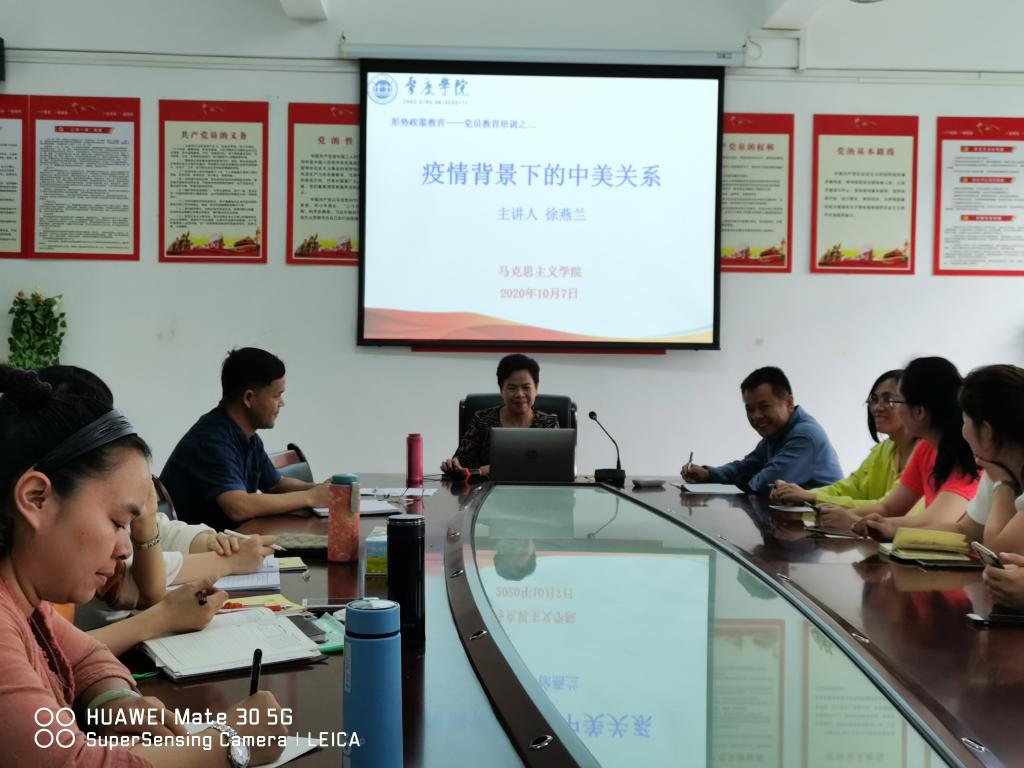 为了进一步加强taptap点点官方网站全体党员教师的党员教育,10月7日下午,taptap点点官方网站徐燕兰教授为学院全体教师作了题为《疫情背景下的中美关系》的党员形势与政策教育培训。