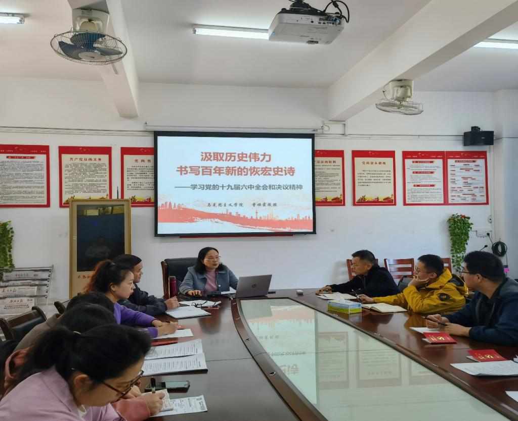 党的十九届六中全会通过了《中共中央关于党的百年奋斗重大成就和历史经验的决议》,为深入学习贯彻党的十九届六中全会和决议精神,马院于12月1日举行全体教师大会,党总支书记曹顺霞以“汲取历史伟力,书写百年新的恢宏史诗”为题进行了宣讲。
