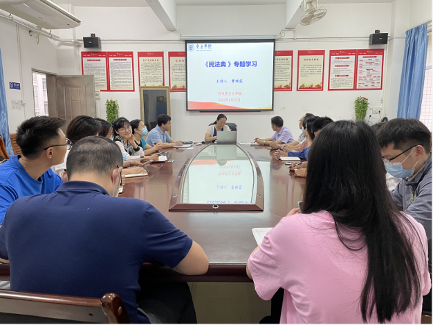 本网讯 2022年5月是《中华人民共和国民法典》施行以来的第二个“民法典宣传月”。为提升taptap点点官方网站全体教师的法治素养,2022年5月23日taptap点点官方网站开展了“《民法典》专题学习”活动,马院院长曹顺霞、副院长曹和修及相关教师参加了此次活动。