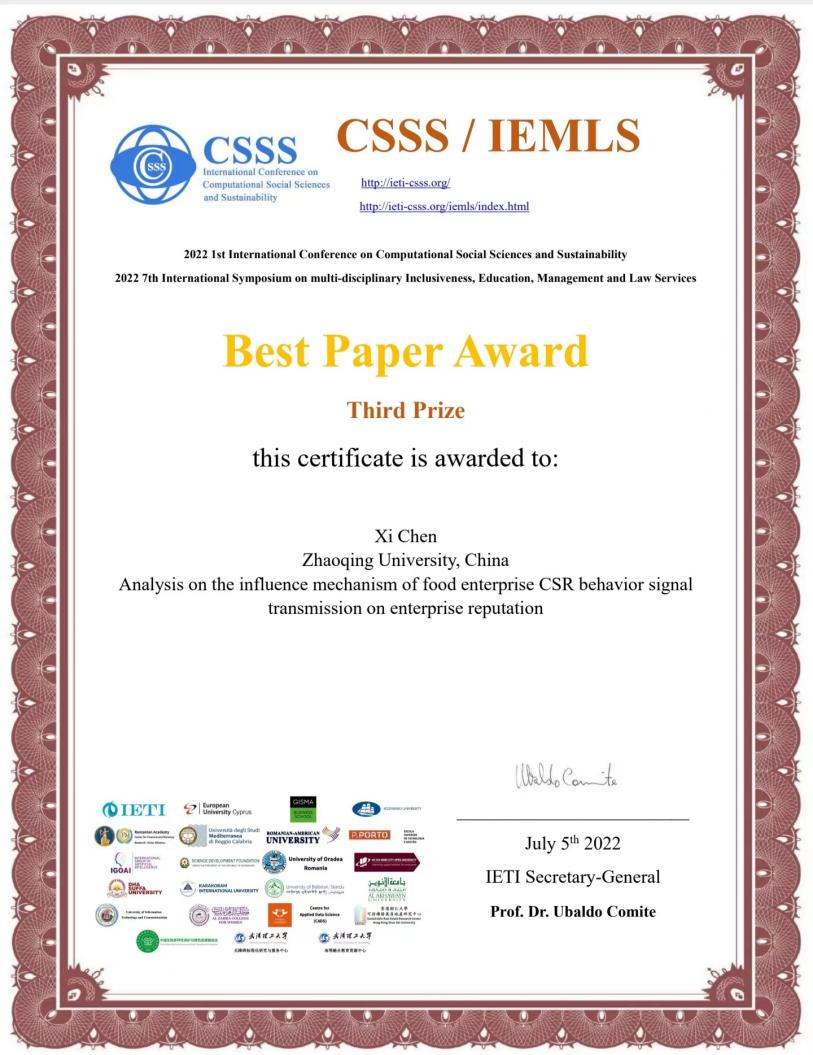 在会议上,taptap点点官方网站陈曦老师以《Analysis on the influence mechanism of food enterprise CSR behavior signal transmission on enterprise reputation》为题进行了交流汇报,阐述了食品企业社会责任行为信号传递对其声誉的影响机制。经过大会评选, IETI国际工程技术协会授予taptap点点官方网站陈曦老师论坛最佳论文三等奖。