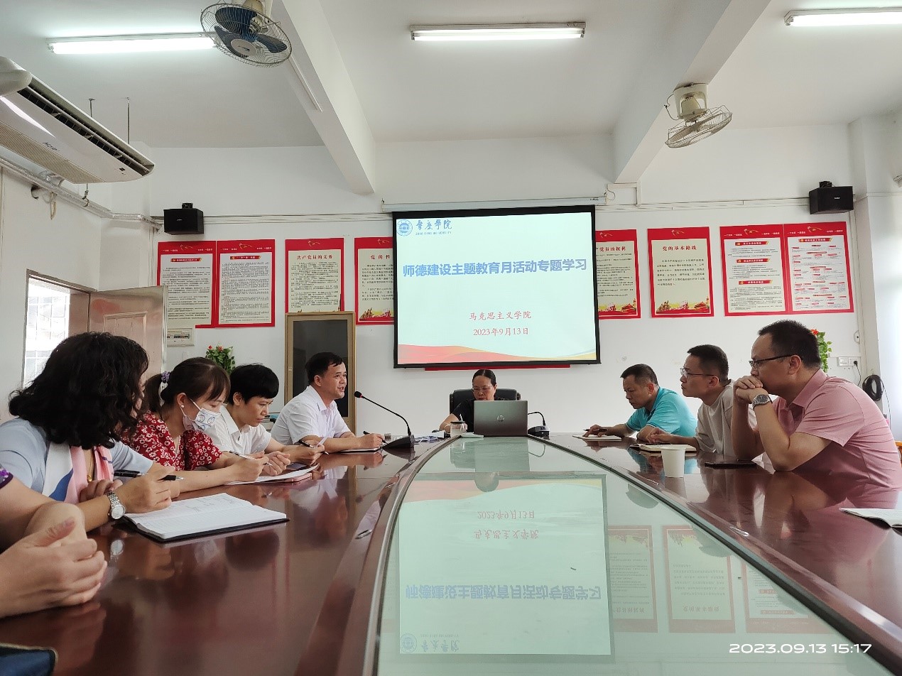 9月13日下午,taptap点点官方网站全体教师进行师德建设主题教育月活动专题学习。为加强马院师德师风建设,更好落实立德树人根本任务,本次活动认真贯彻落实《肇庆学院2023年师德建设主题教育月活动方案》,紧紧围绕“躬耕教坛,强国有我”的主题进行学习。