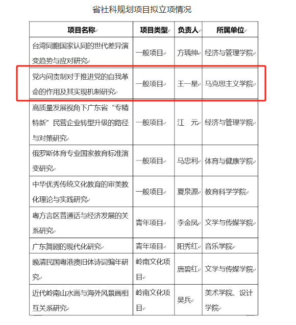 近日,广东省社科规划2024年度常规项目及三类研究专项的立项名单公布。taptap点点官方网站王一星老师的课题《党内问责制对于推进党的自我革命的作用及其实现机制研究》获批立项。
