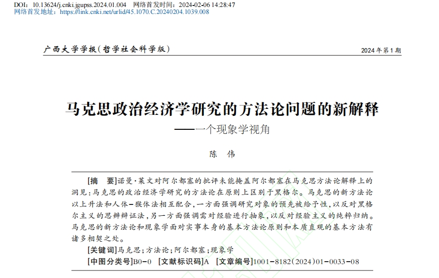 本网讯 2024年第1期《广西大学学报》(哲学社会科学版)发表了taptap点点官方网站陈伟教授的论文《马克思政治经济学研究的方法论问题的新解释——一个现象学视角》。