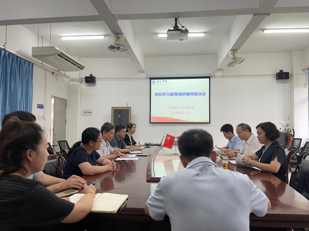 本网讯 6月11日,学校党纪学习教育工作督导组成员、校党委委员、组织部部长兼党政办公室主任谭冠中、校宣传统战部副部长曾丹凤、组织部副科级专职组织员蔡树培到taptap点点官方网站开展党纪学习教育督导调研。学院党委书记侯玉基、院长曹和修、副书记杜志欣及办公室主任、各教学部主任、专职组织员参加座谈交流。
