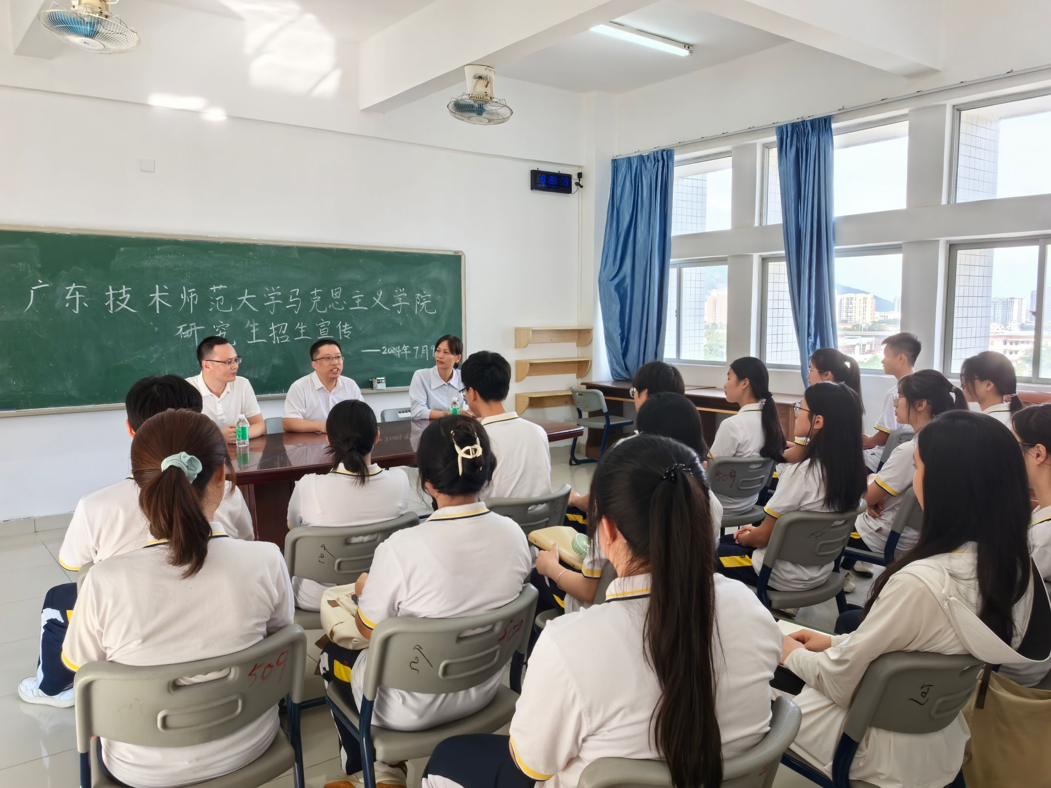 在接下来的交流讨论中,双方系部主任和骨干教师们还围绕研究生课程设置与日常管理、绩效分配工作、师生配比与人才队伍建设、科研团队与经费配套、本硕毕业生就业质量提升、省级样板党支部创建、省级青年教师教学技能大赛、军事理论课程建设等内容进行深入充分的交流和探讨。广东技术师范大学马院秦程节副院长还专门为taptap点点官方网站意向考研的学生开展了研究生招生宣传讲座。