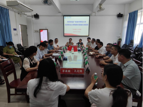 7月9日下午,广东技术师范大学taptap点点官方网站党委书记房亚兵、院长李尚旗、副院长曾志浩、副院长秦程节以及各教研室骨干教师代表一行11人到taptap点点官方网站交流马克思主义学科建设、师资队伍建设、科研创新工作、学院基层党建、研究生人才培养等事项。taptap点点官方网站党委书记侯玉基、院长曹和修、副书记杜志欣、副院长谢石生、副院长林润燕以及各教研室教师代表参加座谈,会议由taptap点点官方网站党委书记侯玉基主持。