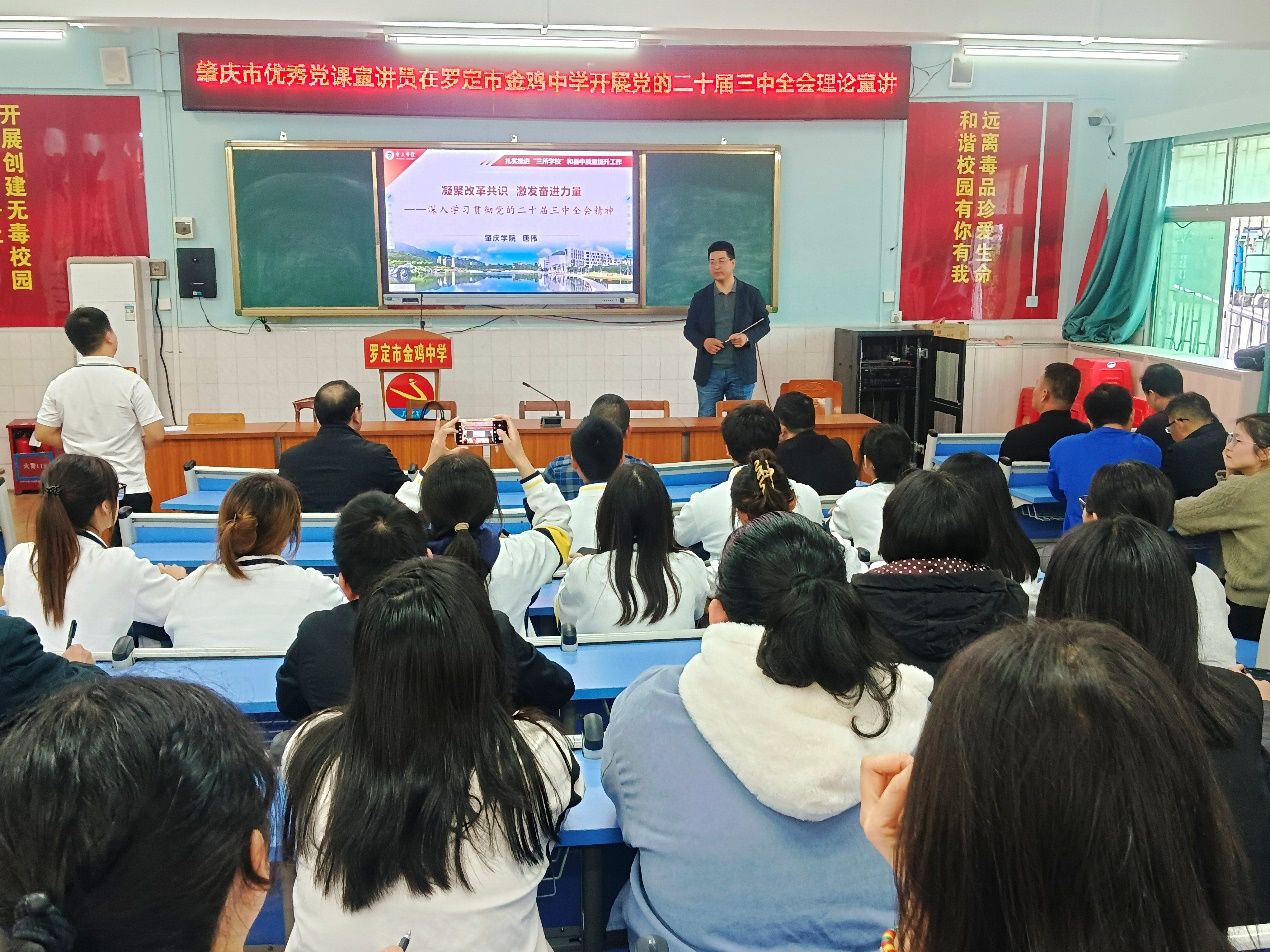 随后,作为肇庆市优秀党课宣讲员的唐伟老师,在罗定市金鸡中学为结对学校的教师代表们进行了一场题为《凝聚改革共识·激发奋进力量——深入学习贯彻党的二十届三中全会精神》的宣讲。唐伟鼓舞在场的老师们要以时不我待、当仁不让的奋斗姿态,共赴改革新征程,为中国式现代化培育时代新人,共同为基层教育改革和质量提升贡献力量。