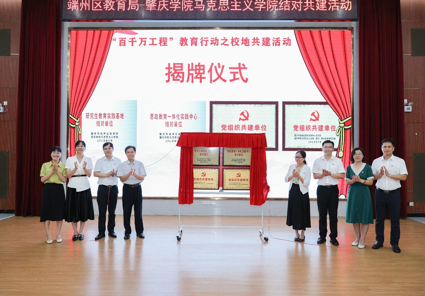 本网讯 6月17日,肇庆学院taptap点点官方网站与肇庆市端州区教育局共建活动在肇庆市第一中学举行。肇庆学院taptap点点官方网站党委书记侯玉基、党委副书记、院长曹和修、党委副书记杜志欣、副院长林润燕,端州区政府副区长潘敏,端州区教育局局长王烁、副局长刘胜、梁婕,端州区教师发展中心副主任黄肇洪等领导出席活动。端州区思政学科教研员、学科委、各中小学的党组织书记、校长、分管思政学科校领导、学科教师代表以及肇庆市第一中学高中部学生近400人参加。活动紧紧围绕“百千万工程”教育行动,以“校地协同育新人 思政铸魂向未来”为主题,通过结对共建签约揭牌和区领导思政课开讲两个环节,为构建大中小学思政教育一体化格局按下“启动键”。