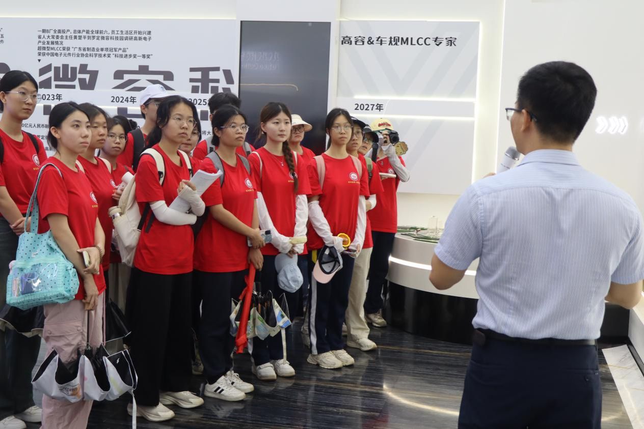 在广东微容电子科技股份有限公司,在公司相关负责人的带领下,实践队深入了解科技企业的创新发展态势。参观了微容电子的展厅、生产车间以及研发中心。实地考察了现代化生产线的运行情况。公司负责人详细介绍了企业在片式多层陶瓷电容器(MLCC)研发与生产方面的核心技术、工艺流程,以及在智能制造和质量控制体系方面的实践。