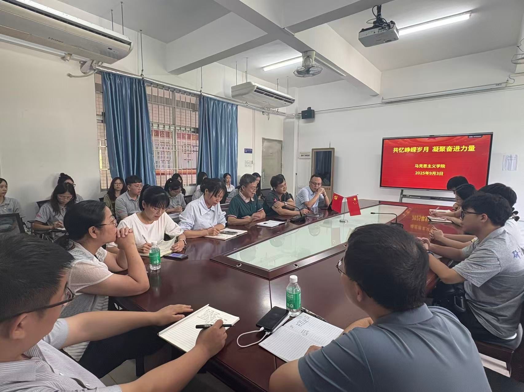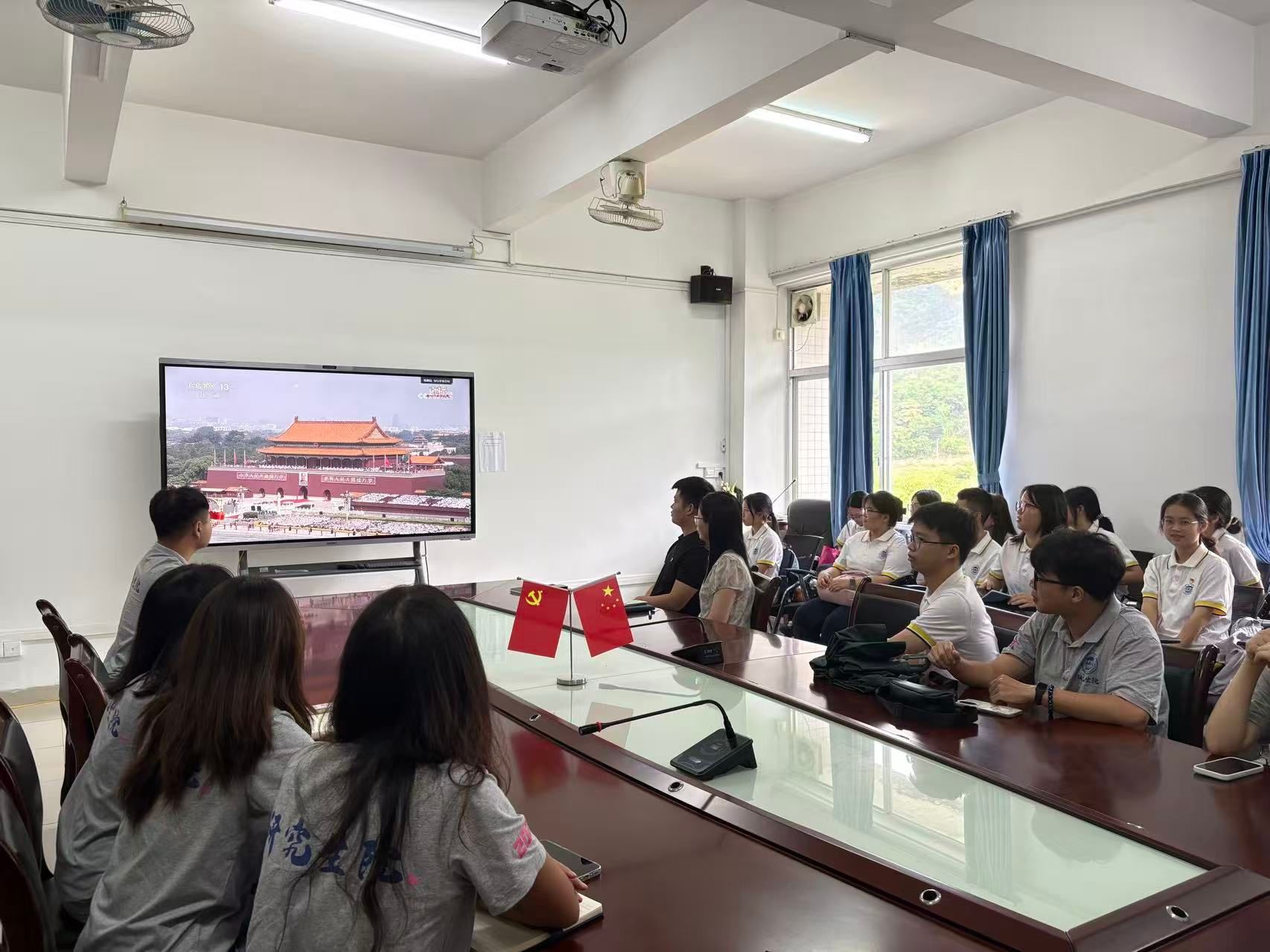 本网讯 为深切缅怀革命先烈,传承弘扬伟大抗战精神,纪念中国人民抗日战争暨世界反法西斯战争胜利80周年,2025年9月3日上午9时,肇庆学院taptap点点官方网站组织师生代表在学院会议室集中观看纪念中国人民抗日战争暨世界反法西斯战争胜利80周年阅兵直播,共同见证庄严时刻、感悟历史厚重,直播结束后还召开专题座谈会,让红色记忆在交流中深化,让爱国情怀在分享中升华。