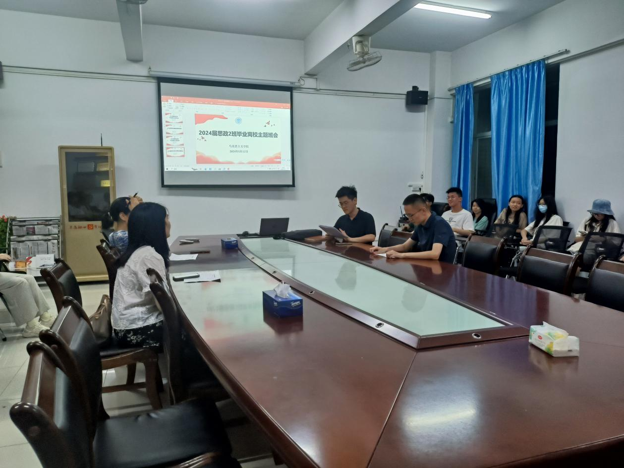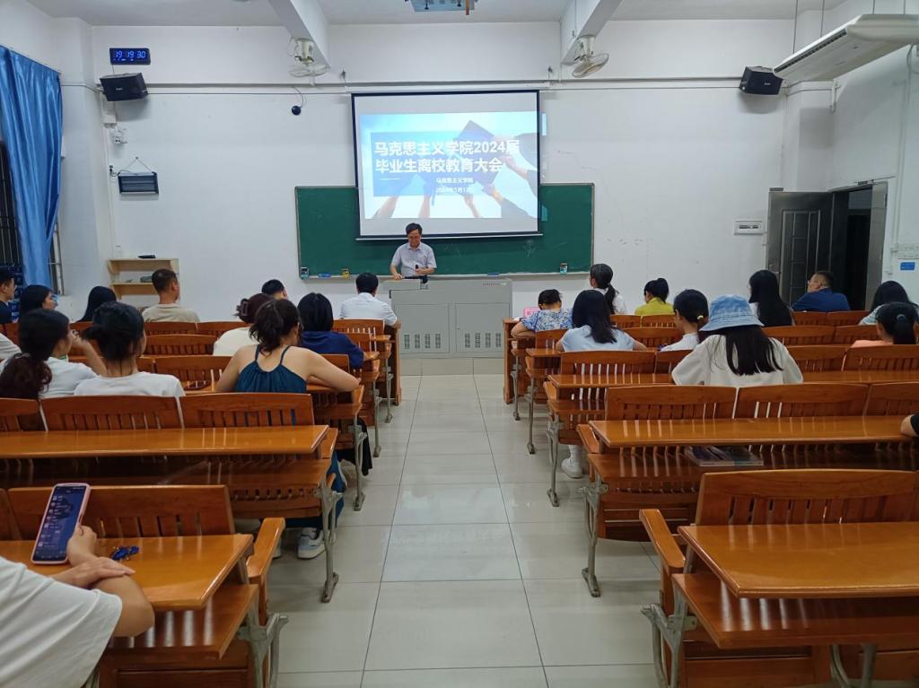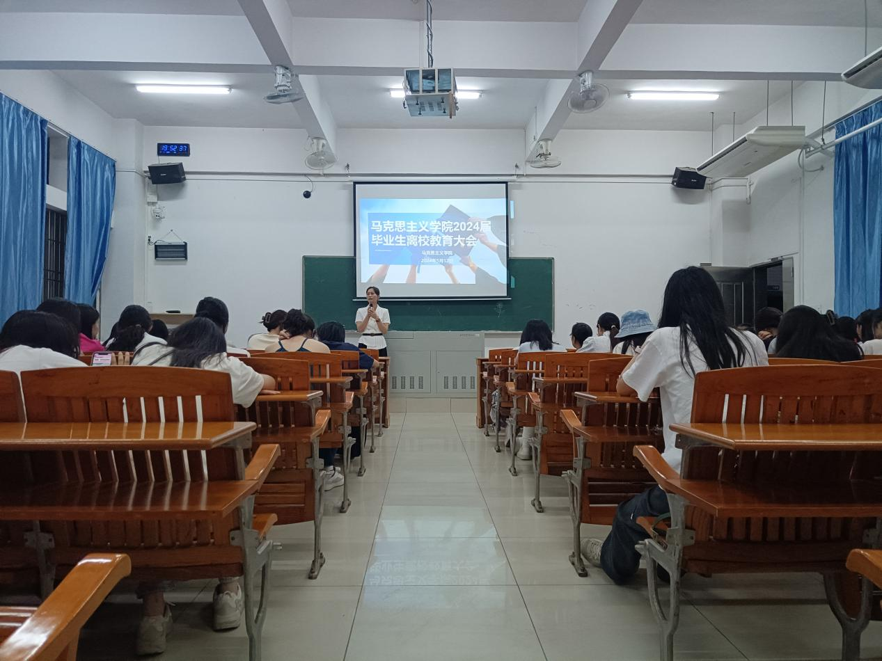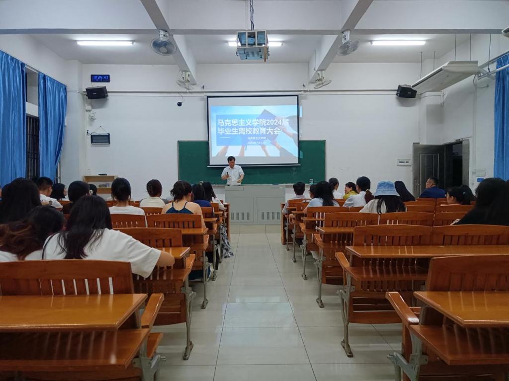 本网讯 为加强马院2024届毕业生的思想政治教育,强化人文关怀,增进爱校情感,引导毕业生做有理想、敢担当、能吃苦、肯奋斗的时代新人,努力营造文明有序、积极向上、健康和谐的毕业氛围,5月17日晚,学院在三教108室召开了2024届毕业生离校教育大会。学院党政领导班子成员、辅导员、班主任、就业导师和全体2024届毕业生参加。
