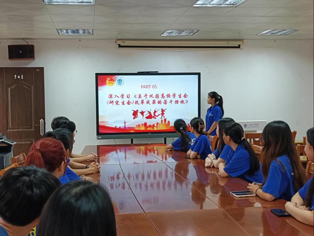 会议共有六项议程。首先,全体起立,奏唱团歌。随后,社会实践部负责人张水燕带领学生会全体学生骨干,深入学习中国共产党第二十次全国代表大会会议精神,深入学习习近平总书记在全国 “两会”期间的重要讲话精神,深入贯彻落实习近平总书记致全国学联二十七大的贺信精神,贯彻落实广东学联第十二次代表大会精神,深化学生会专题理论学习,深入学习《关于巩固高校学生会(研究生会)改革成果的若干措施》文件精神等。培训学员纷纷表示,要贯彻“全心全意为同学服务”的宗旨,筑牢理想信念,优化学院学生会队伍建设,带领全院同学共同进步。