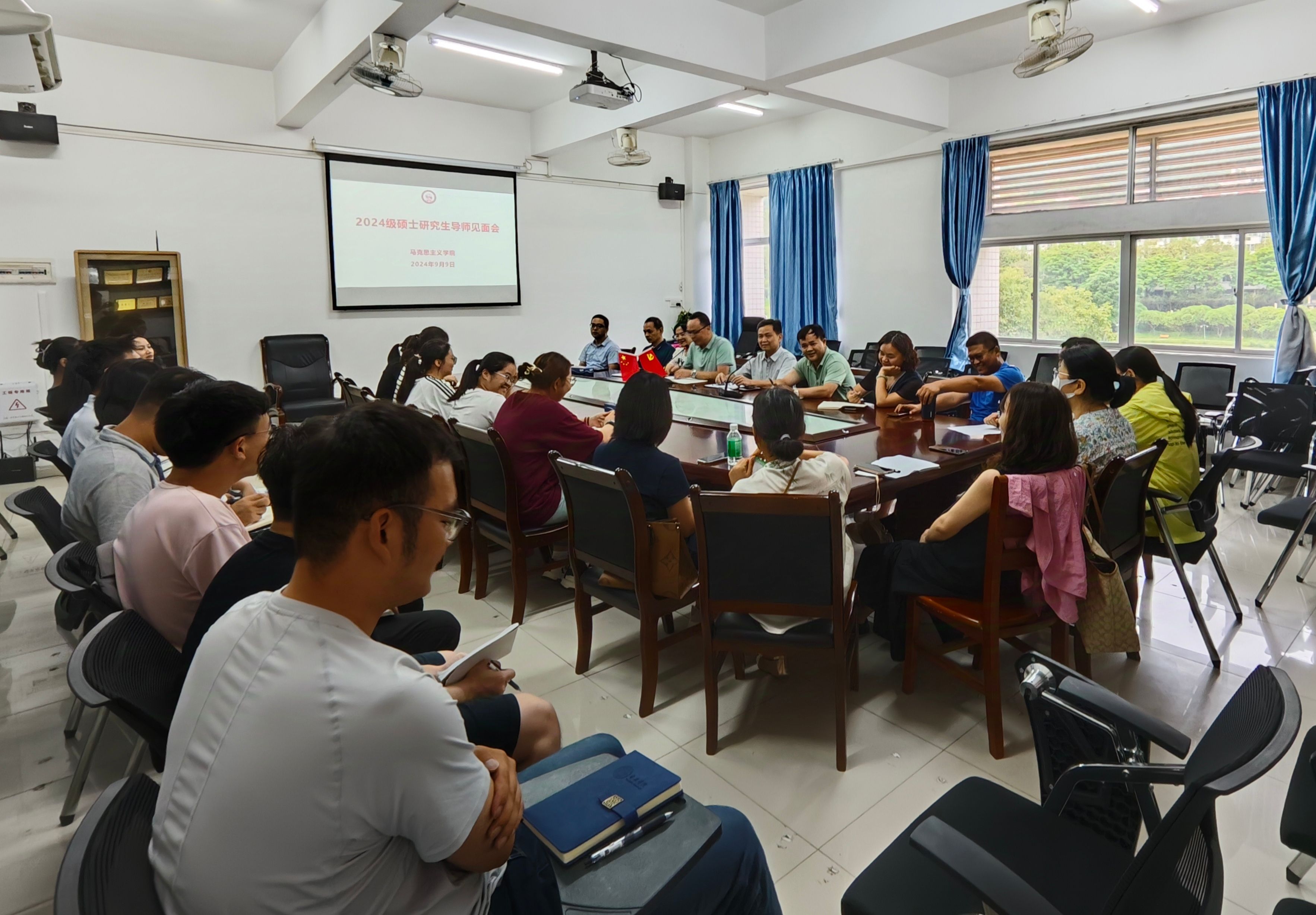 在会上,2024级研究生新生首先逐一进行了自我介绍。紧接着,谢石生隆重介绍了学院全体硕士研究生导师,宣读研究生导师双选结果。之后,曹和修代表学院发表热情洋溢的讲话,对研究生新生表示热烈欢迎,详细介绍了学院的发展历史、机构设置、师资队伍、发展成就,鼓励同学们珍惜求学时光,积极与导师联系沟通,规划好三年研究生学习生涯,主动融入新的学习环境。最后,侯玉基代表学院党委寄语新生,希望大家把握机会,学业和就业并重,在向自己导师学习的同时,积极向学院优秀教师看齐学习,精进学习和科研,度过充实而高效的研究生生活,并祝愿2024级研究生乘风破浪,扬帆起航,不忘初心,共筑马院辉煌的明天!