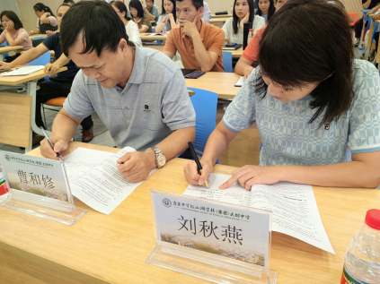 本网讯 10月18日,taptap点点官方网站赴广东省东莞市与东莞市第七高级中学、东莞市大朗中学举行研究生联合培养基地签约授牌仪式。taptap点点官方网站院院长曹和修、副院长林润燕、教师朱晶、王磊与东莞市第七高级中学副校长宋章峰、主任黄上水、东莞市大朗中学校长刘秋燕、行业导师等出席仪式。