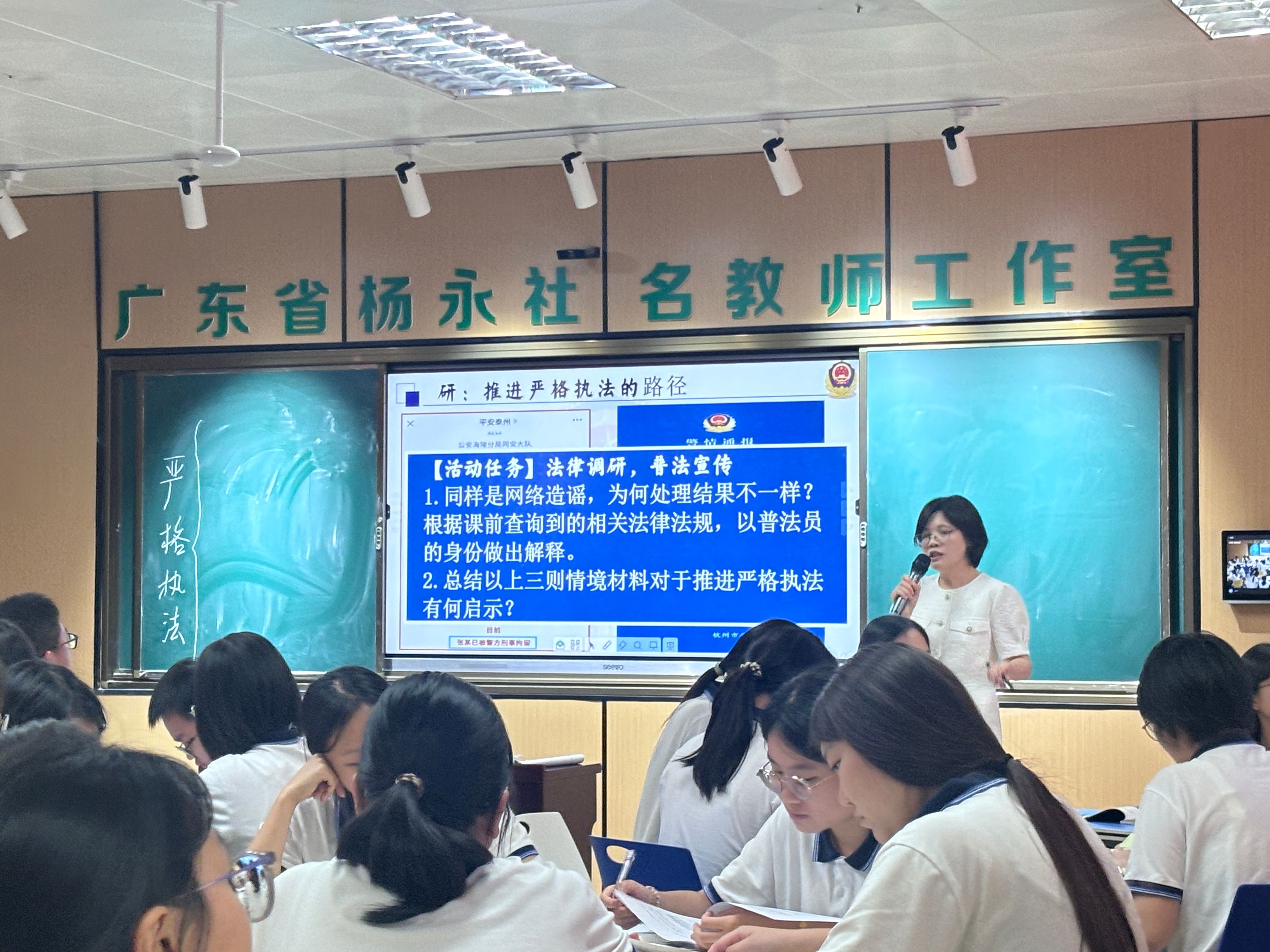 东莞中学松山湖学校(集团)东莞市第十三高级中学杨永社校长在点评中指出,两节课各具特色:杜老师的情境模拟教学生动呈现了执法过程中的现实矛盾,有效培养了学生的法治思维;唐老师的议题式教学层层递进,既紧扣社会热点,又创新引入AI技术,为法治教育提供了新思路。两节课共同体现了“以学生为中心”的教学理念,为法治课堂的创新发展提供了优秀范例。