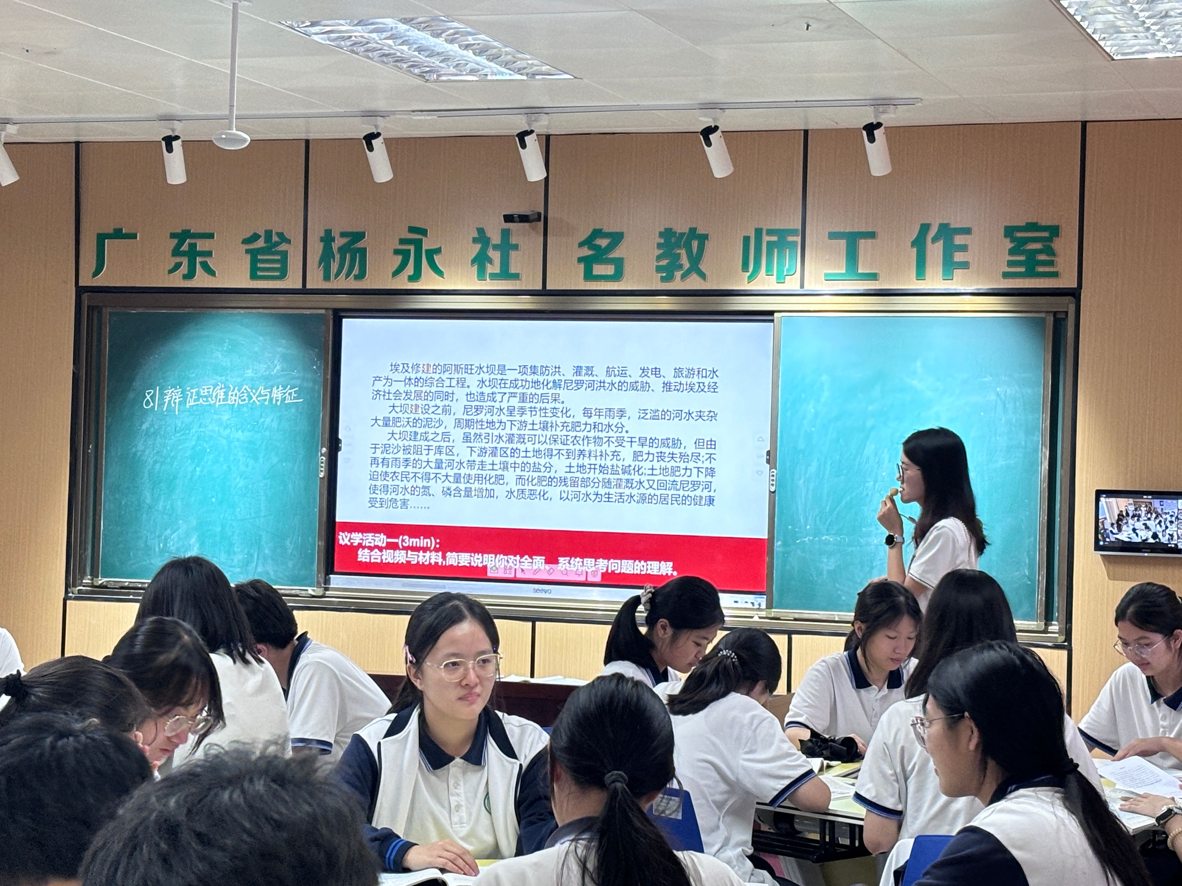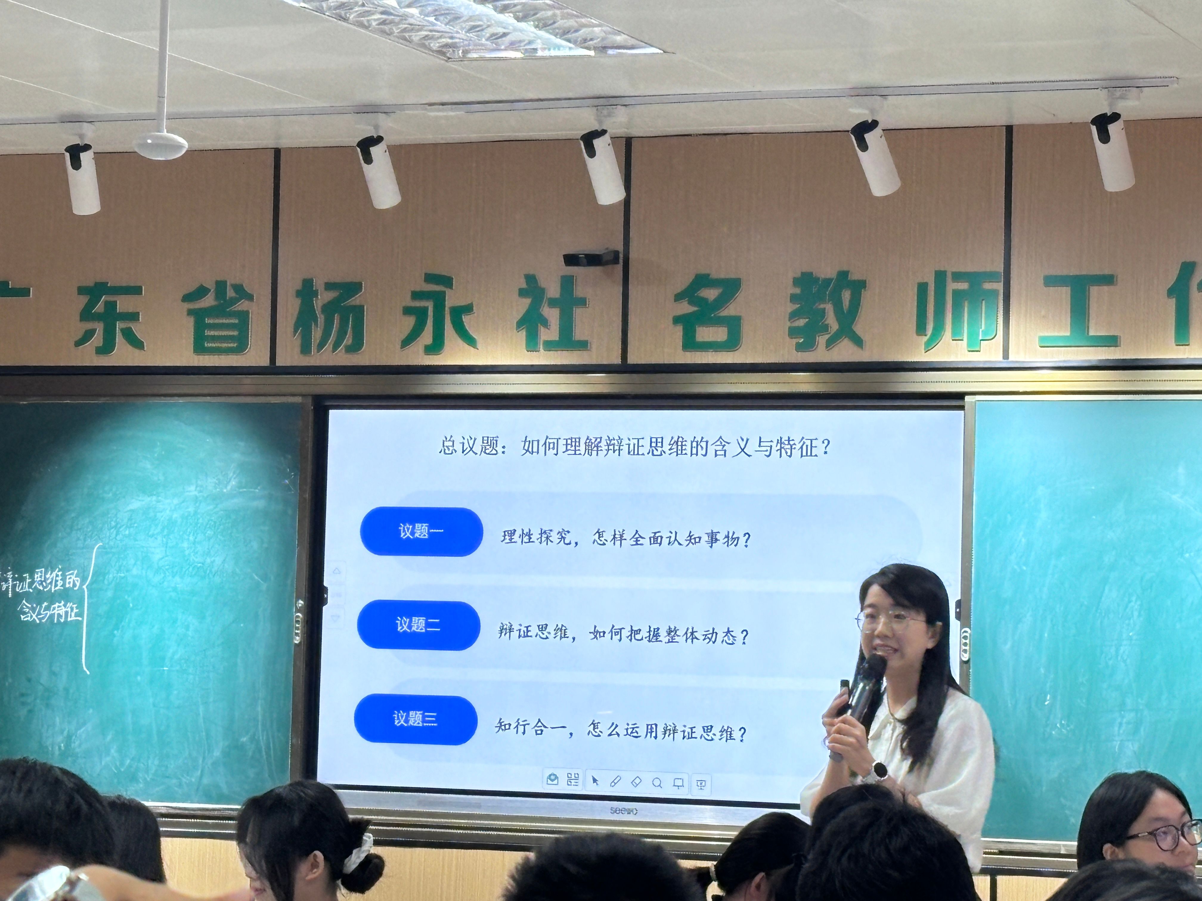 东莞市教育局教研室汤逸山教研员高度评价两节课:胡竞荣老师以都江堰与阿斯旺大坝案例对比,巧妙解构矛盾转化,将辩证思维的动态性与整体性融入历史脉络,实现哲学与人文的融合;陈小霞老师从AI日常应用切入,通过“算法与人性”思辨引导学生透视技术本质,彰显辩证思维在科技时代的导航价值。