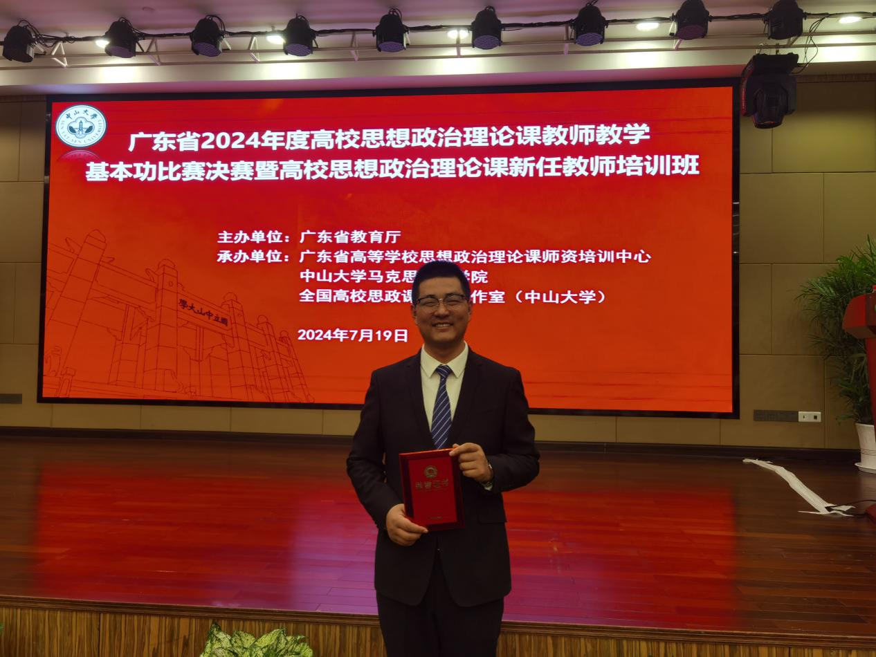 本次大赛由广东省教育厅主办、广东省高校思想政治理论课师资培训中心(中山大学)承办,汇集了省内高校众多优秀思政课教师参加。大赛从今年4月份启动,历时3个多月,分为省级初赛、省级复赛、省级决赛三个阶段。2024年度入围决赛的共有24位选手,分别来自我校与暨南大学、华南师范大学、深圳大学等高校。唐伟老师在决赛中教学思路清晰明了,教学方法灵活多样,教学案例丰富新颖,教学仪态端庄得体,面对评委的提问沉稳作答,展现出扎实的教学基本功和深厚的专业素养,赢得了评委和在场观摩老师的一致认可。